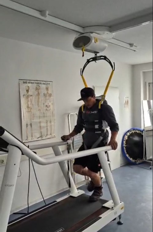 Geh-Training in der Physiopraxis mit dem Deckenlifter und Geh-Gurt